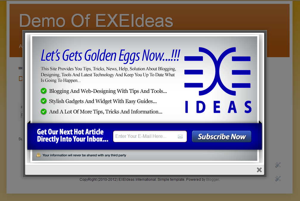 Version-2 Is Also Released, Check Out The New Features. Awesome EXE-Style POP-UP V1 Is A Stylish Design J-Query POP Ups With Color Box Coding And Having Borders Which Nearly 90% Same As POP UP Domination. It Will Attract Your Subscriber Too And Force Them To Subscribe Your Beautiful Updates. This is a POP UP Domination For Blogger And Website. You Are On That Page Where You Are Going To Get POP UP Domination For Blogger And Website Not WordPress.