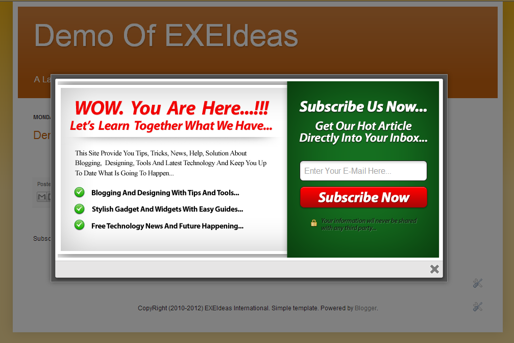 Version-2 Is Also Released, Check Out The New Features.Cool EXE-Style POP-UP v1 Is A Stylish Design J-Query POP Ups With Color Box Coding And Having Borders Which Nearly 90% Same As POP UP Domination. It Will Attract Your Subscriber Too And Force Them To Subscribe Your Beautiful Updates. This is a POP UP Domination For Blogger And Website.You Are On That Page Where You Are Going To Get POP UP Domination For Blogger And Website Not WordPress.