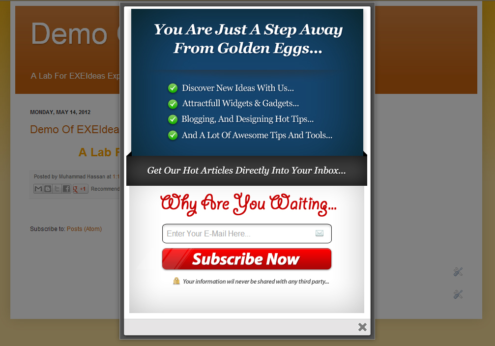 Version-2 Is Also Released, Check Out The New Features.Gorgeous EXE-Style POP-UP V1 Is A Stylish Design J-Query POP Ups With Color Box Coding And Having Borders Which Nearly 90% Same As POP UP Domination. It Will Attract Your Subscriber Too And Force Them To Subscribe Your Beautiful Updates. This is a POP UP Domination For Blogger And Website.You Are On That Page Where You Are Going To Get POP UP Domination For Blogger And Website Not WordPress.