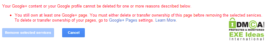 • You still own at least one Google+ page. You must either delete or transfer ownership of this page before removing the selected services. To delete or transfer ownership of your pages, go to Google+ Pages settings. Learn More