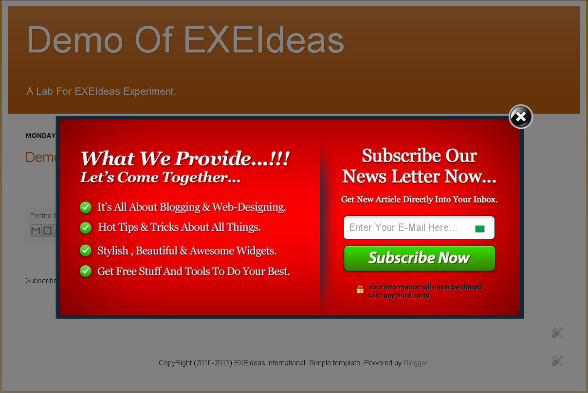 EXE Style POP UPs Version-4 Is Another Awesome Designed HTML-CSS-Single Line One Function JavaScript Code But Even No External JavaScript File Or Without Any Jquery File Or Code POP Ups With Simple Basic CSS Coding With A Wonderfull Simple And Small Code By Us That Is Used In This Version To Make It More Awesome And Try To Stop Bothering Your Visitors And Also Without Having Borders Which Nearly 99.99% Same As POP UP Domination. It Will More Attract Your Subscriber Too And Force Them To Subscribe Your Beautiful Updates Because It Will Not Be POPUPed On Page Load As Many Othewrs Do, When A Visitor Come On Your Page Then The POPUP Appear So The Visitor Will Not Subscribe Your Updated Because They Didn’t Yet Read Out Any One Word From Your Page So How They Will Subscribe You Then They Will Close It And Even After Reading Full Article Of Your Blog, If They Want TSubscribe Then They Have To Search The Subscribtion Box So They Don’t And Leave. Now Here From POPUP That Will Not Appear On Page Load, It Will Remain Hidden And After 30sec (You Can Change The Time) If Will Appear. From Now The Visitor Have Full Satisfied From Your Content And Now He Will Subscribe You With Open Heart And From This You Can Increase Your RSS List And Royle Readeship Too. As A Demo Of EXE Style POP UPs Version 4 ScreenShoot Is Given Below.