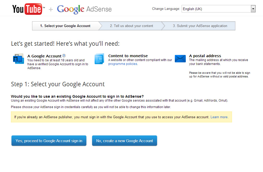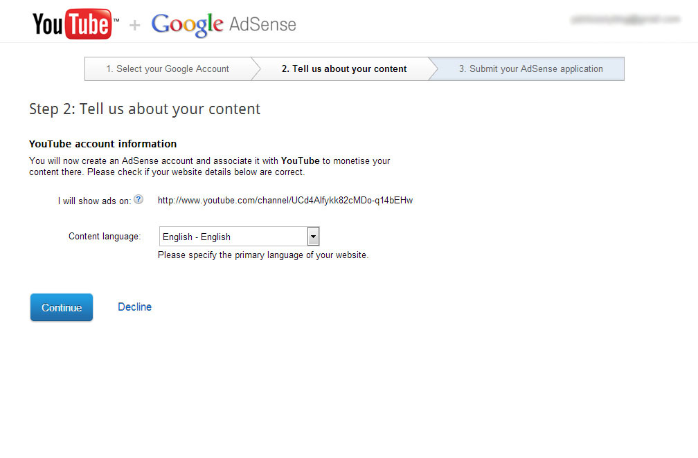 Step 5:) Here after some time you will be redirected on YouTube + Google AdSense account register page.