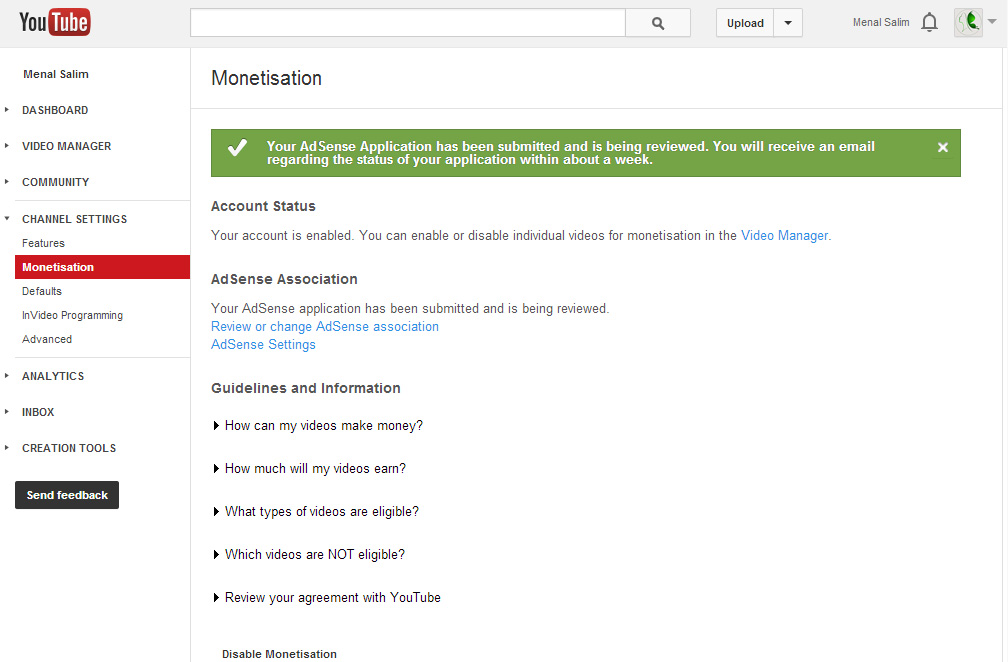 Step 11:) Now you will be again on YouTube “Monetization” page with a green DIV showing some text. This will be your confirmation message but don’t worry about WEEK term. Just wait one hour and check your email, your account will be confirmed.