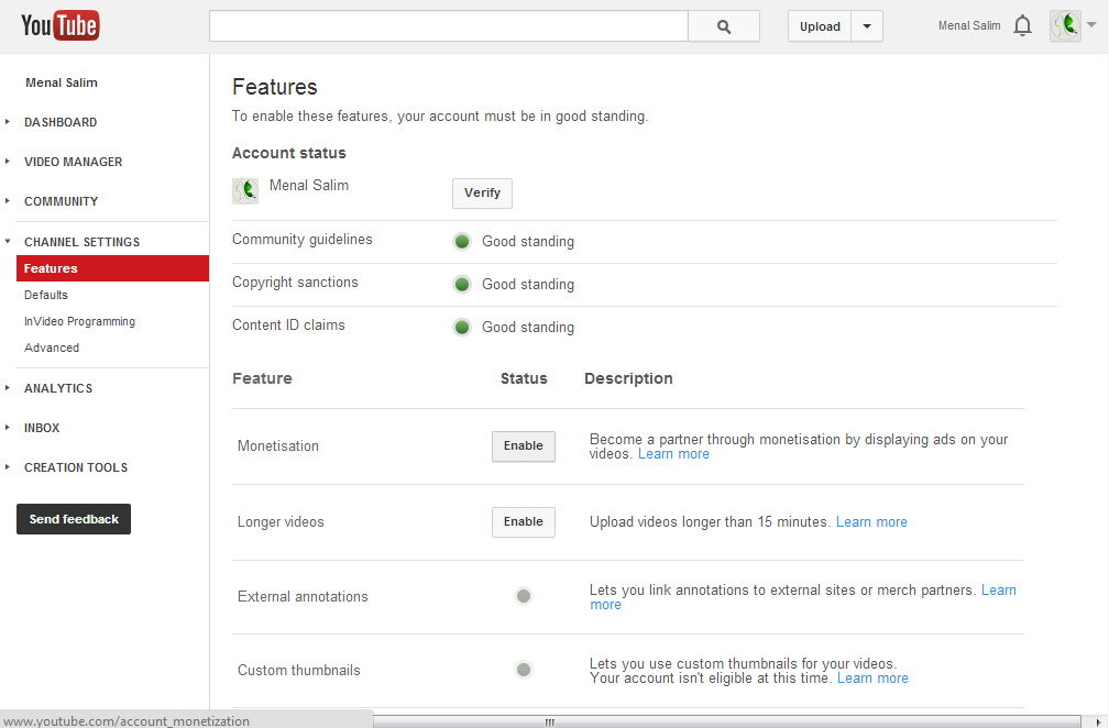 Step 1:) First open Features page and see the three green lights via www.youtube.com/account_features